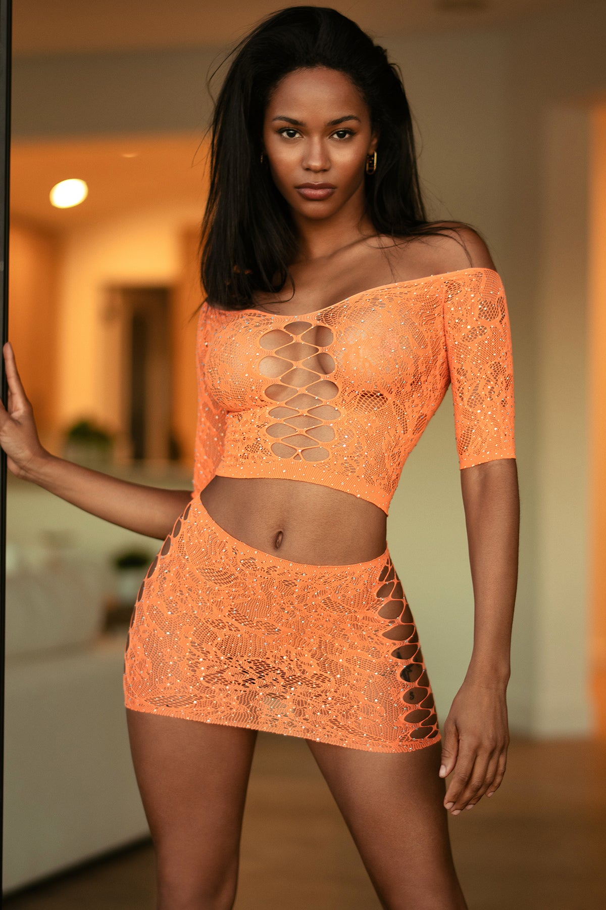 Racing in love and finished in rhinestones, this fishnet set will bring all the eyes on you.